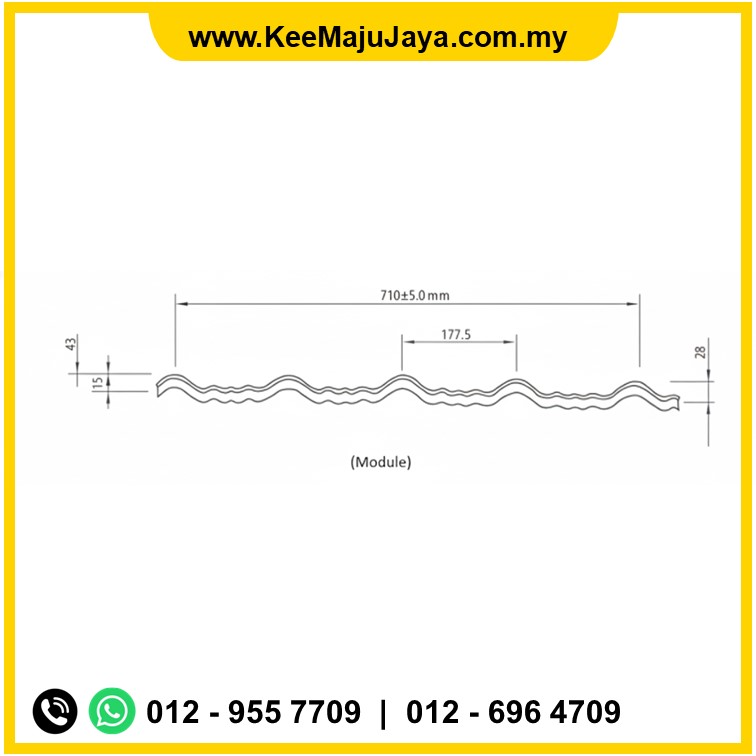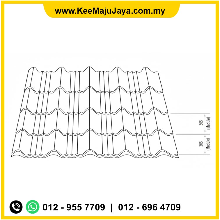 Jawapan 1: Sistem atap ini mempunyai lebar berkesan 710 mm dan ketinggian rib 28 mm. Panjang modul standard adalah 305 mm dengan ketinggian langkah (step height) 15 mm.