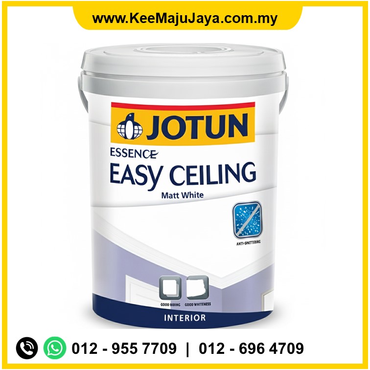 ANSWER 1: For high-traffic commercial zones in Kuala Lumpur, we recommend JOTUN Essence Easy Ceiling. Its specialized anti-spatter technology is engineered to minimize paint droplets during overhead roller application, significantly reducing cleanup time for contractors.
